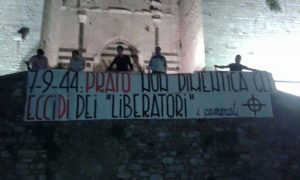 “Oggi CasaPound Italia e Etruria 14 – chiariscono nel profilo Facebook di Etruria 14 – hanno deposto una corona di fronte al Castello dell’Imperatore, dove il 7 settembre 1944 un gruppo di partigiani guidati da Marcello Tofani trucidò un numero ancora imprecisato di persone. Di questa storia non se ne parla nei libri di storia. Questa è una storia che negli ultimi due anni non ha suscitato nessuna parola di commiato da parte dell’amministrazione comunale. Così oggi ci abbiamo pensato noi”. In particolare, lo striscione recava scritto: “7-9-44: Prato non dimentica gli eccidi dei liberatori” firmato “I camerati”.